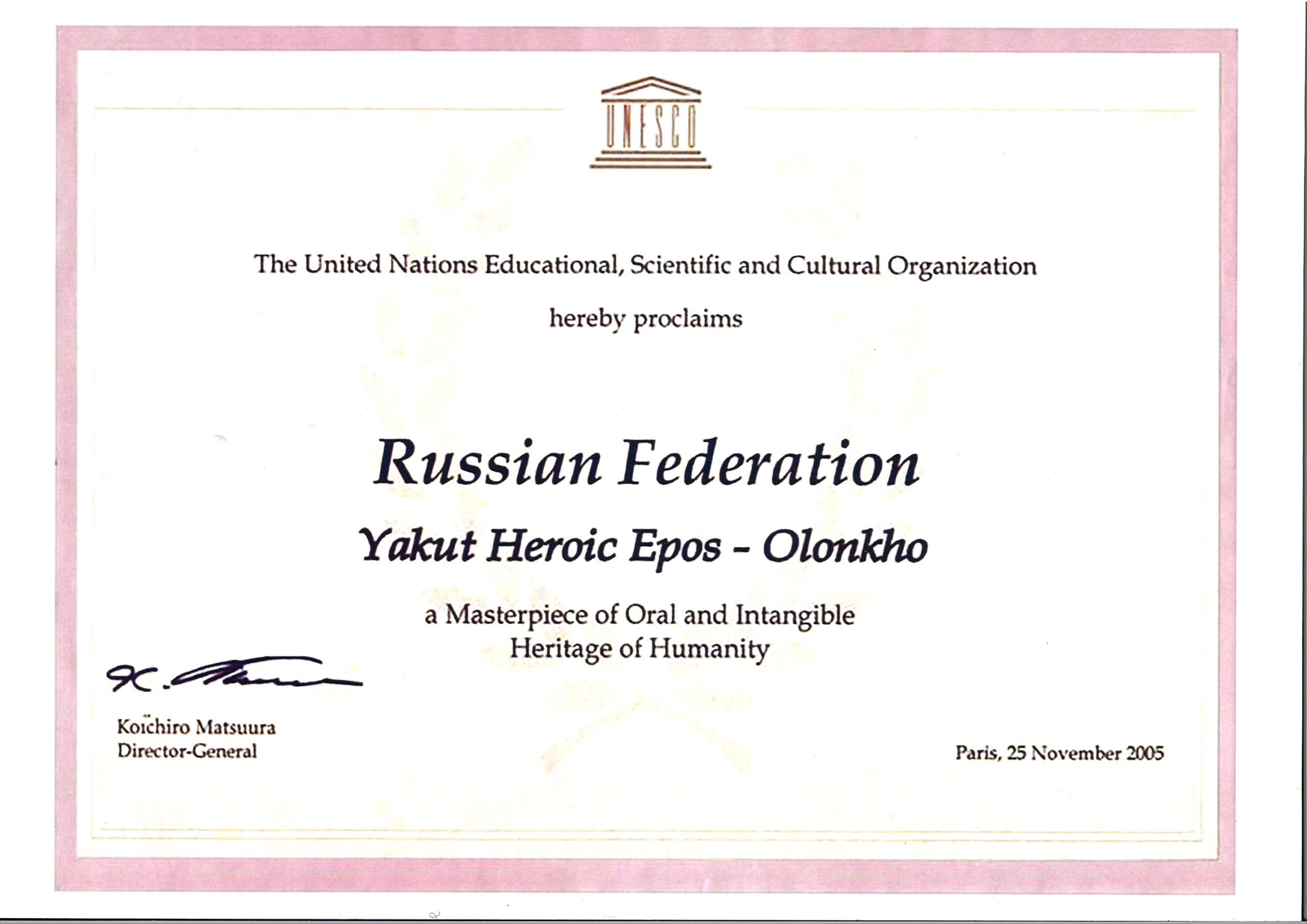 2005 сыл сэтинньи 25 күнүгэр Парижка аан дойдутааҕы жюрига 80 досье киирбититтэн, 43-һэ кылаан чыпчаал буолбута. Биһиги досьебыт уопсастыбаннай түмсүү, Олоҥхо ассоциациятын аатыттан барбыта. ЮНЕСКО биһиги досьебыт научнай өттүнэн үчүгэйдик оҥоһуллубутун хайҕаан, аны атын омуктарга үтүө холобур, “образец” курдук буолбуппут.