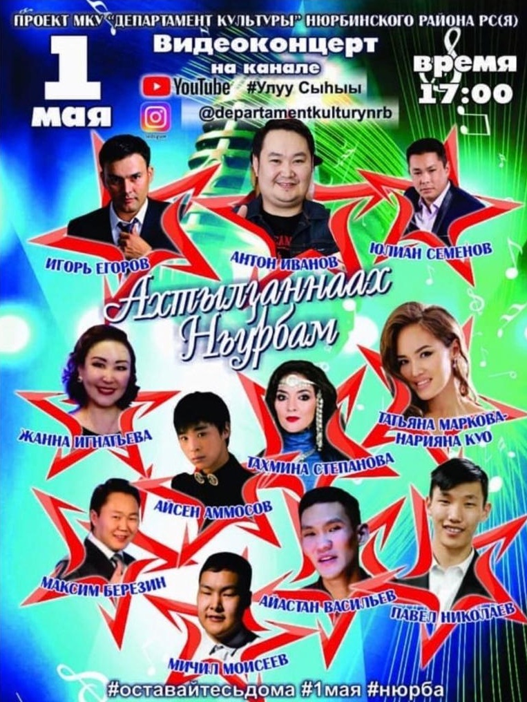Онлайн-кэнсиэр Ньурба улууһун «Култуура департамена» тэрилтэтин бырайыагын быһыытынан ыытыллар. Бырааһынньыктааҕы киэһэни дьиэттэн тахсыбакка, кэнсиэр көрөн, сэргэхсийэн атаарыахха.